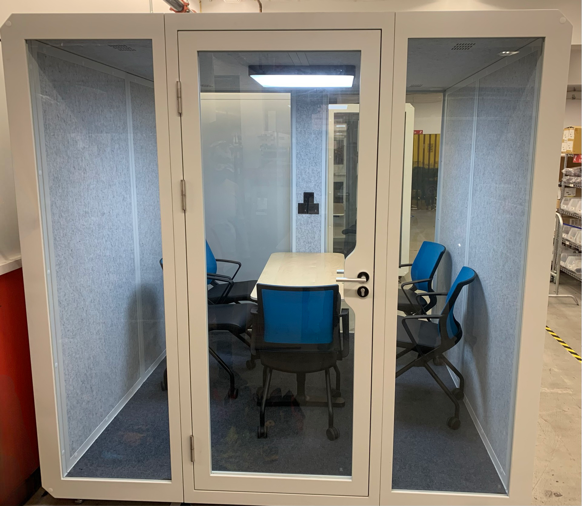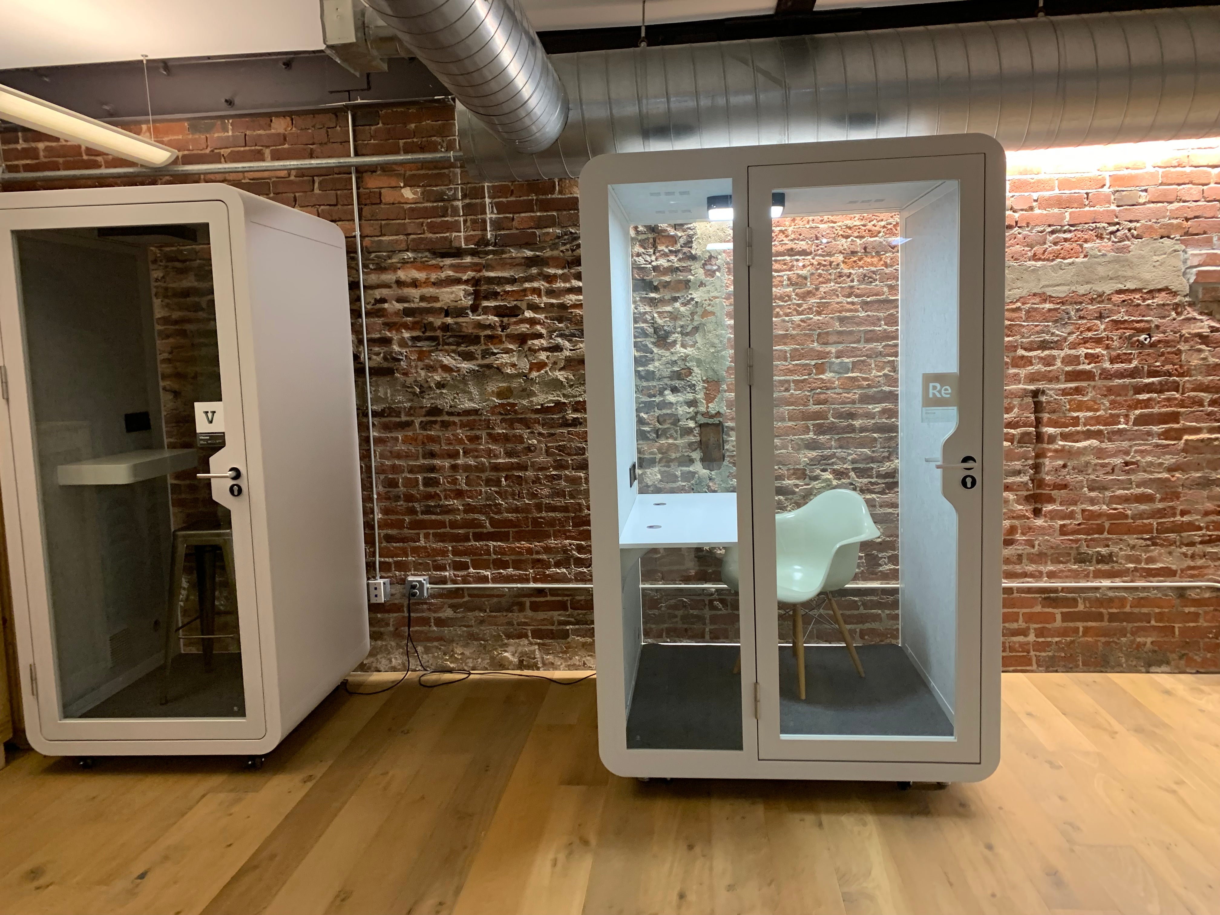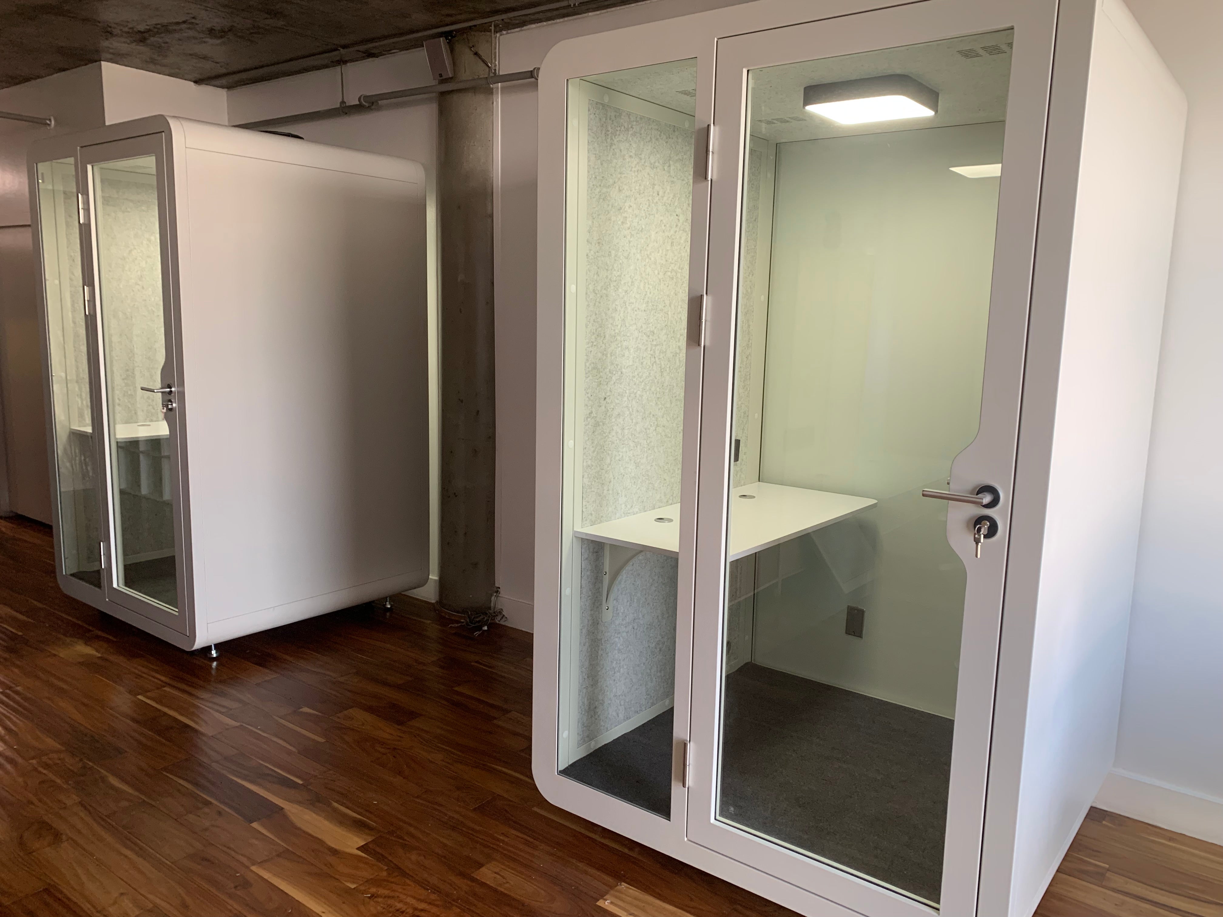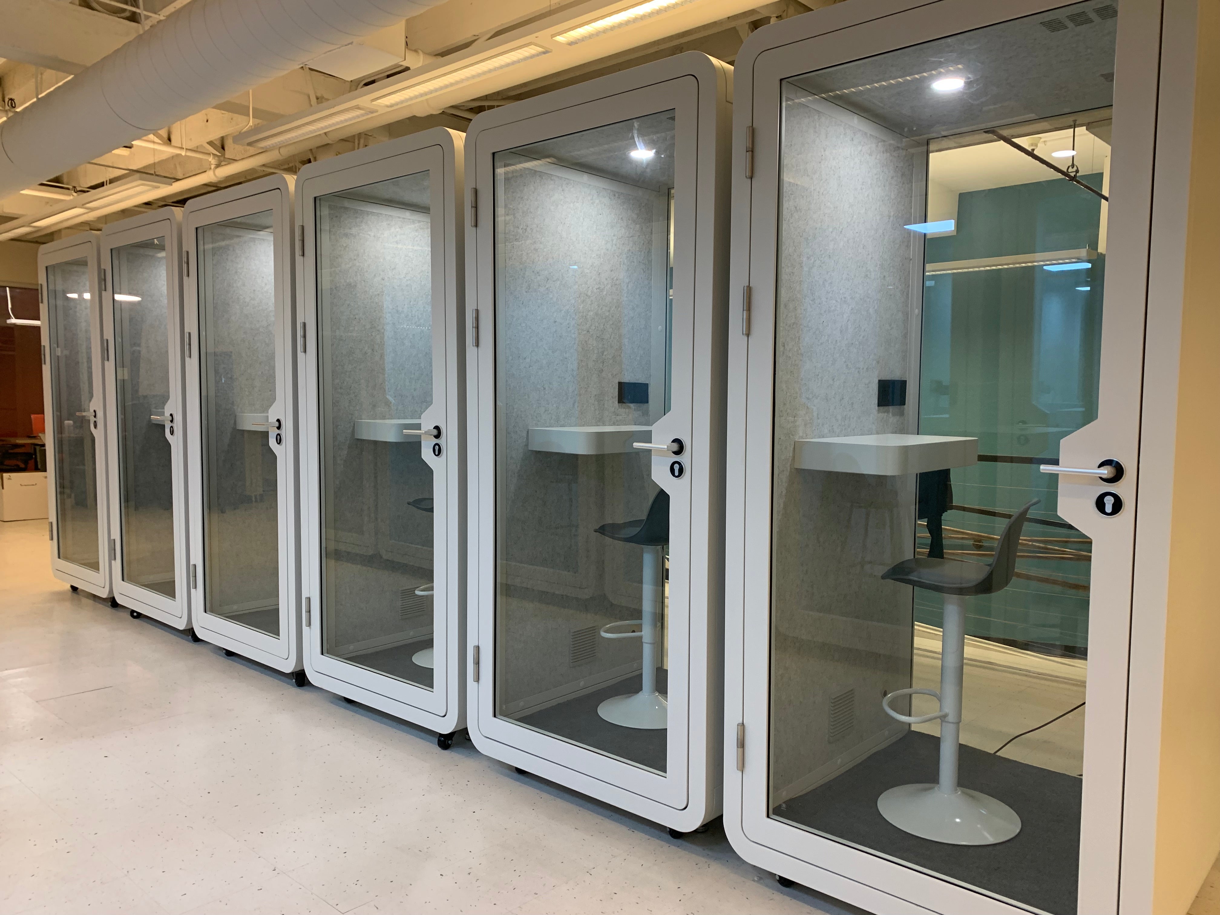 - Thoughtful Lighting: Illuminated by overhead LED lighting, the phone booth creates an ambiance that encourages concentration and focus. Booth glass door and rear wall allow for ample natural lighting as well.